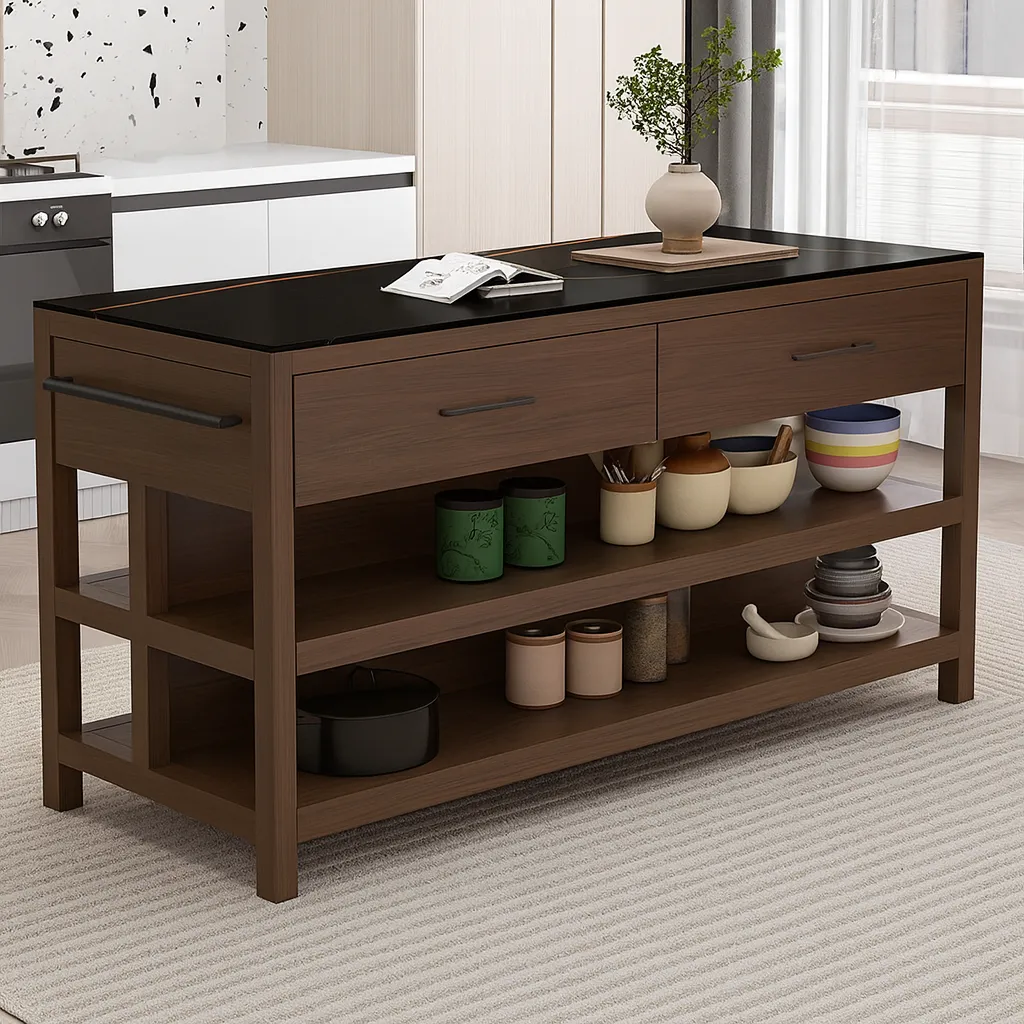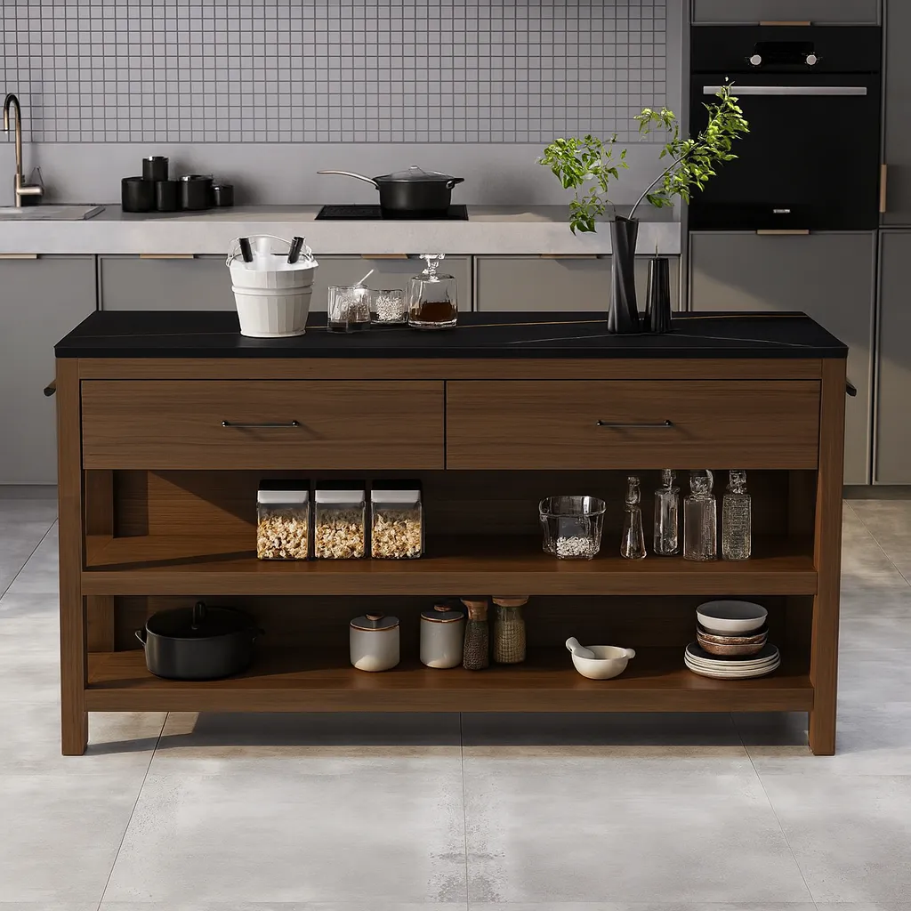 This modern kitchen island is designed to bring both style and practicality to your cooking space. Featuring a sleek black countertop, it offers a durable and elegant surface for meal prep, serving, or displaying kitchen essentials. The island includes two spacious drawers for utensils and small items, along with two wide open shelves that provide easy access storage for cookware, dinnerware, or pantry supplies.