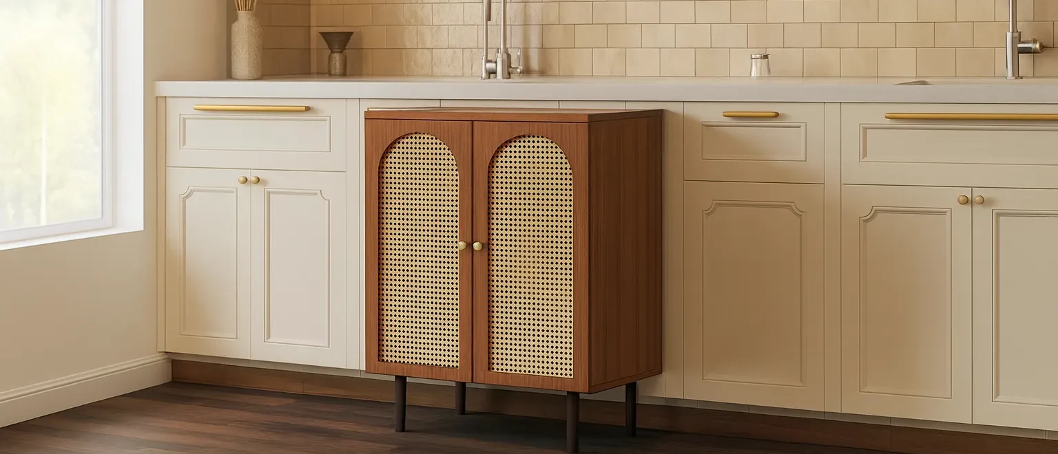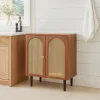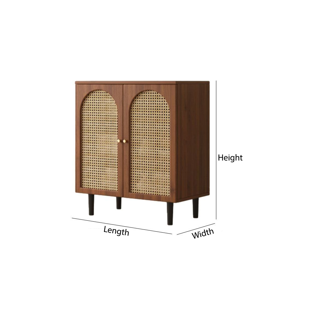 Crafted with an art deco influence, this wooden sideboard blends decorative charm with practical storage. The design features arched rattan weaved doors that bring texture and visual interest to the piece. The sideboard offers a sturdy wooden structure with an ample countertop, making it suitable for displaying décor, storing tableware, or organizing household items. Its raised legs provide stability while keeping the design light and balanced.