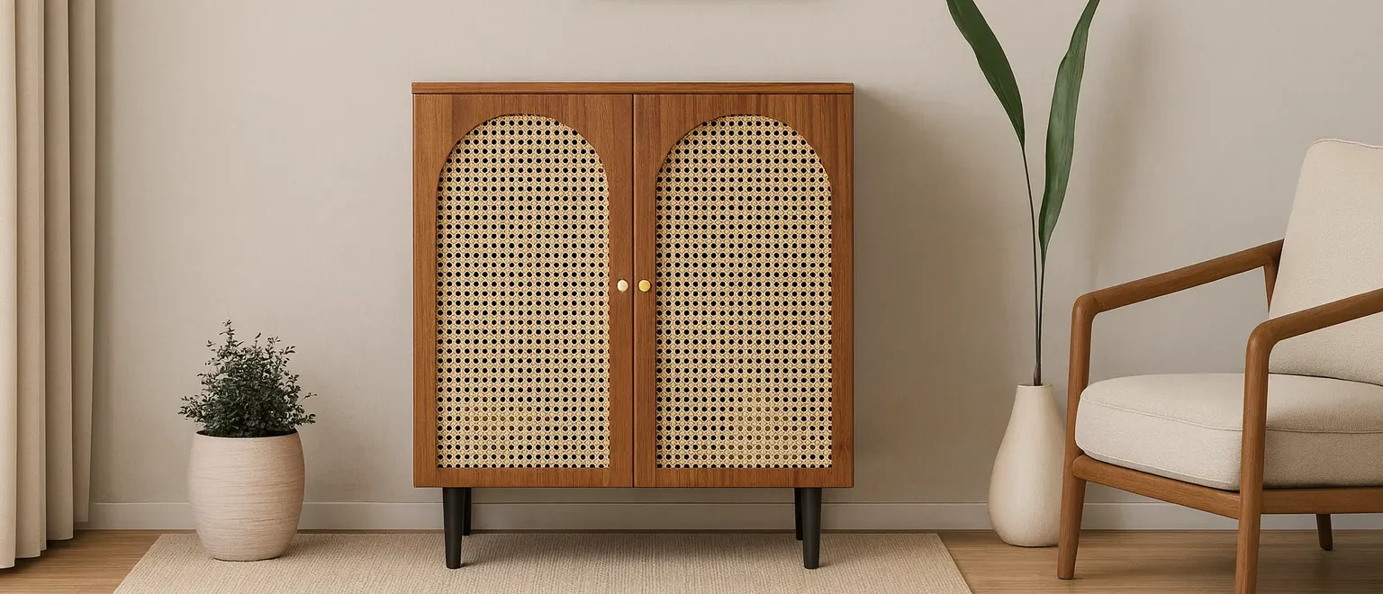 This art deco sideboard features rattan-weaved doors, a wooden structure, and spacious storage, combining style with everyday functionality.