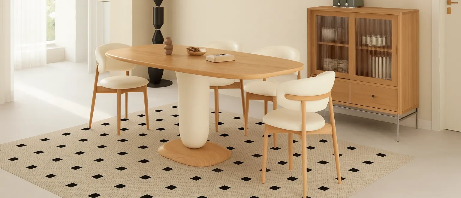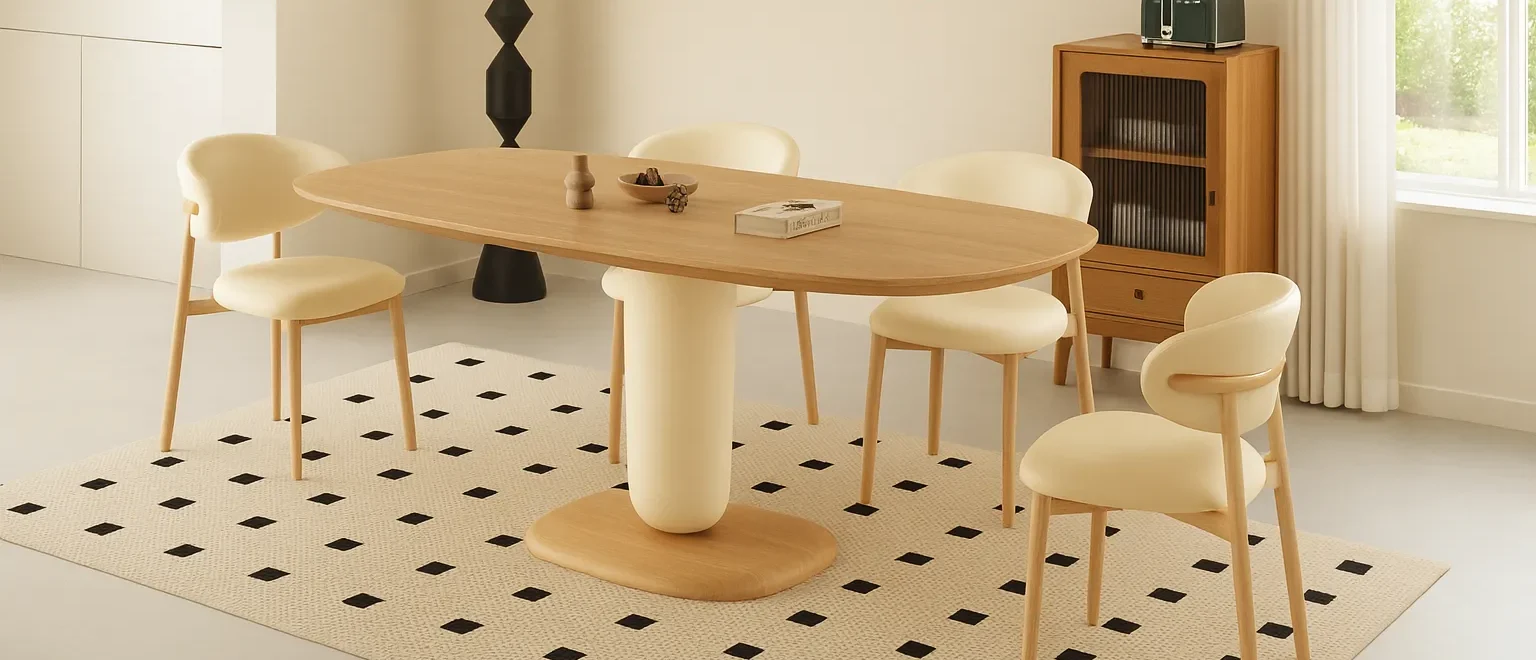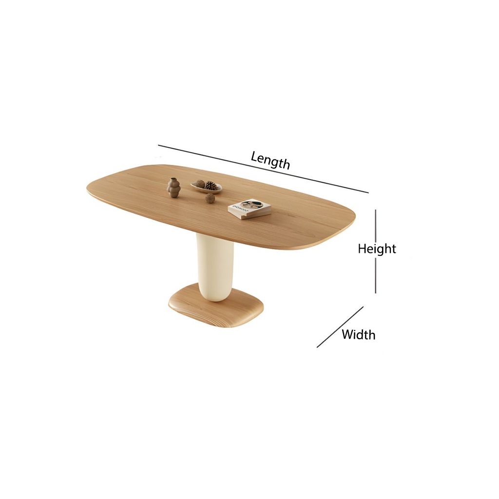Designed with a modern approach, this wooden dining table offers a clean and balanced look for your home. The soft rectangular shape and smooth finish create an inviting space for meals and gatherings. The tabletop is crafted from wood with natural grain patterns, supported by a stable pedestal base for reliable use. Its fixed structure ensures lasting stability, while the rounded edges add to its contemporary design.
