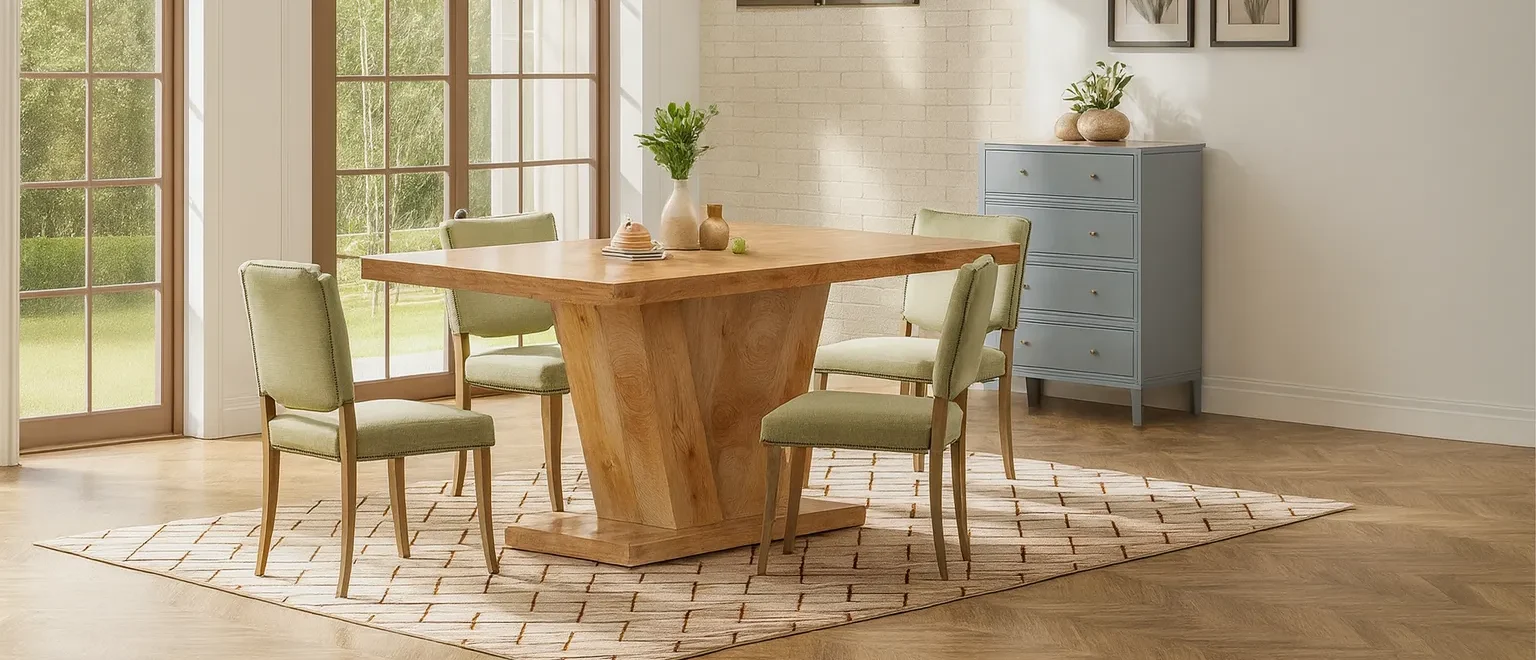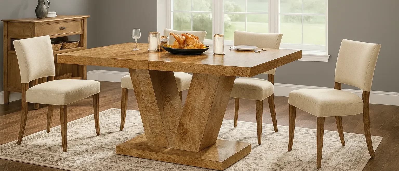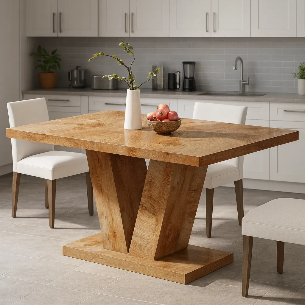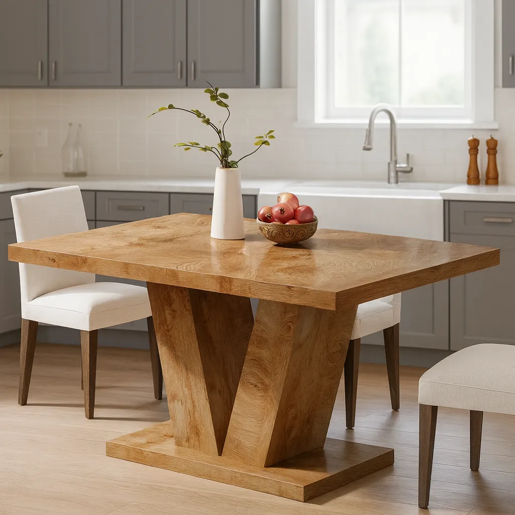 This Minimalist solid oak wood dining table features a bold V-shaped base and rectangular top, creating a stylish focal point for everyday meals and gatherings.