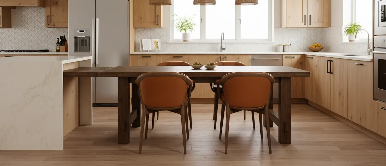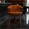 This modern wooden dining chair offers a refined balance of elegance and comfort. The wooden frame showcases smooth curves, while the upholstered seat and backrest provide a supportive and inviting sitting experience. Designed with armrests and a contoured structure, the chair ensures ergonomic comfort during long meals or gatherings. The leather-like upholstery complements the rich wood finish, adding a touch of sophistication to any interior.