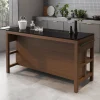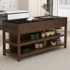 Contemporary wooden kitchen island with black countertop, two drawers, and open shelves for versatile storage.