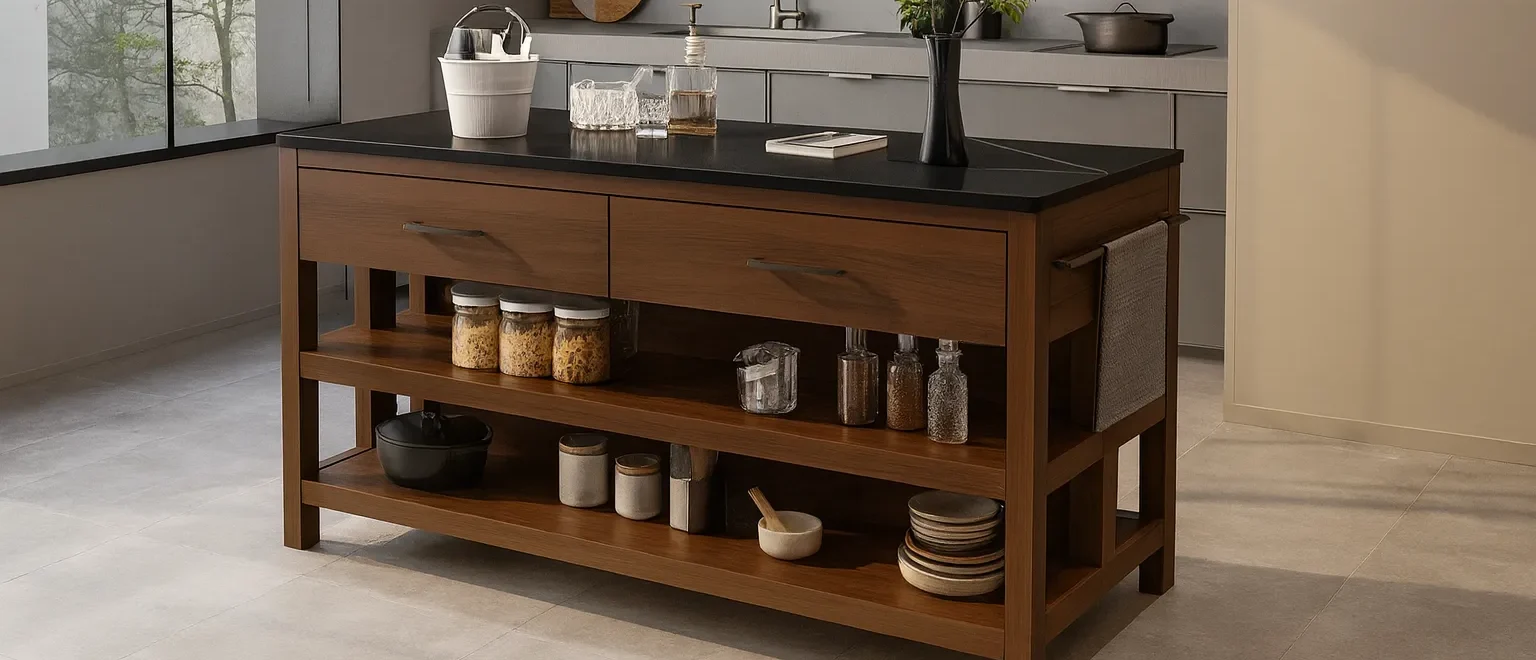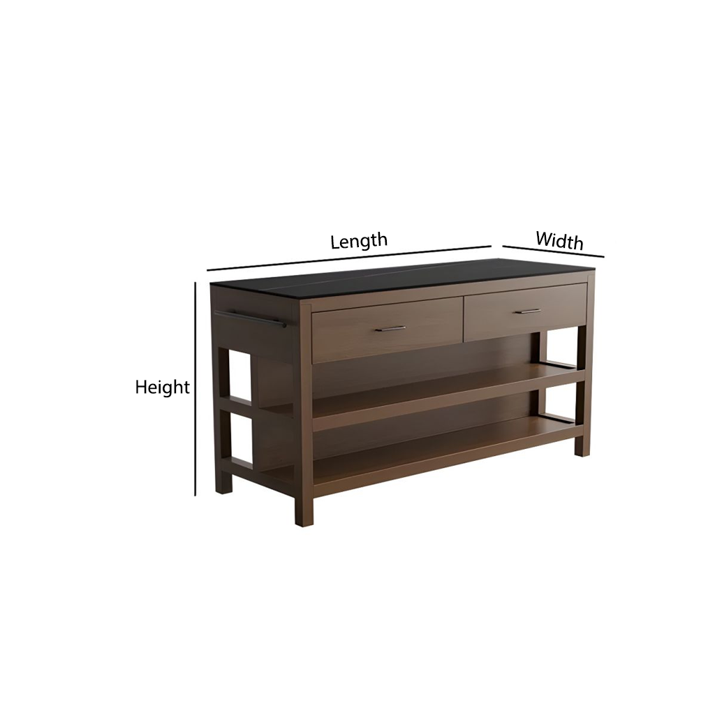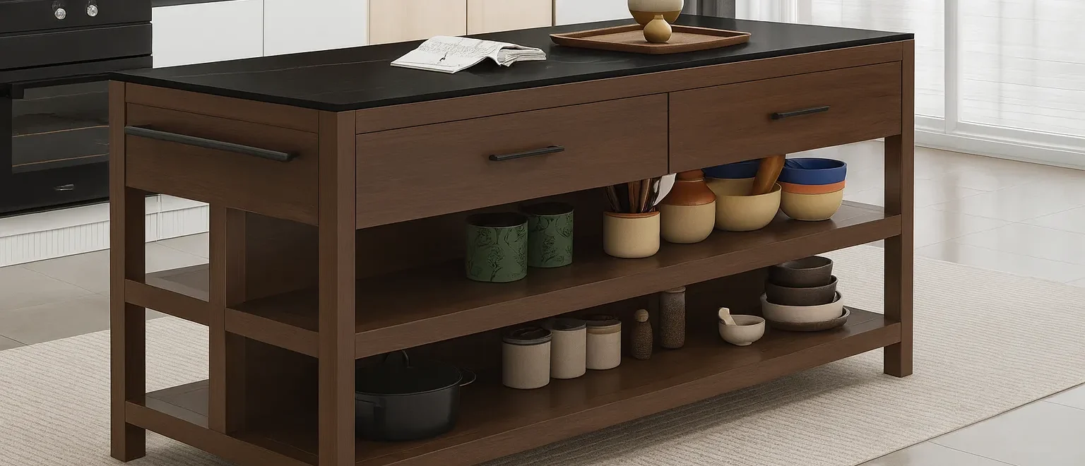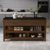 Contemporary wooden kitchen island with black countertop, two drawers, and open shelves for versatile storage.