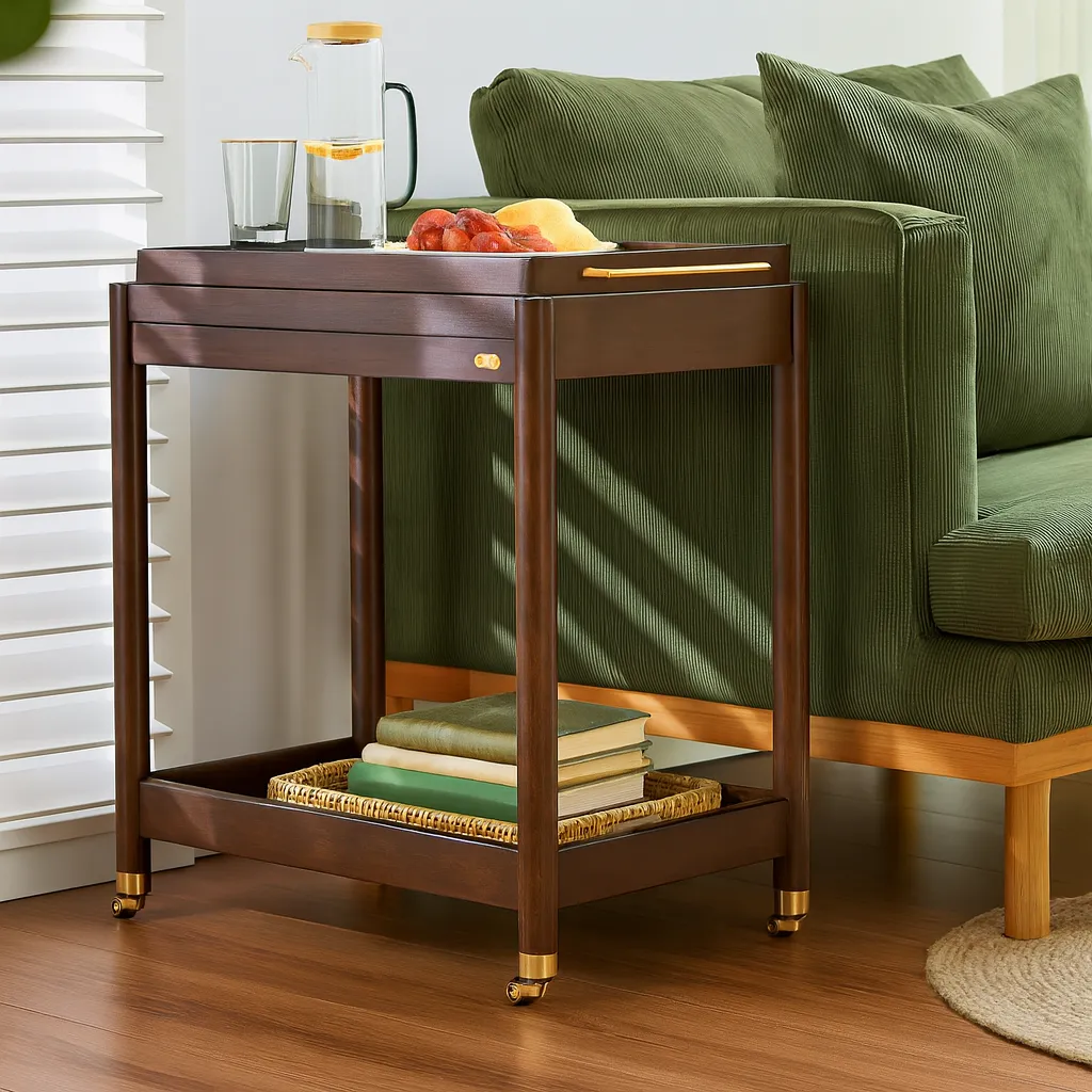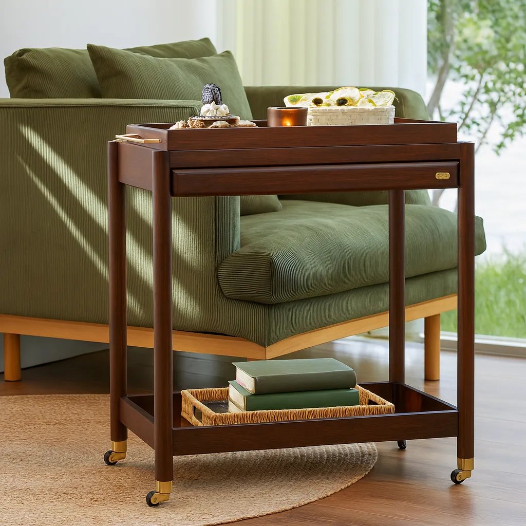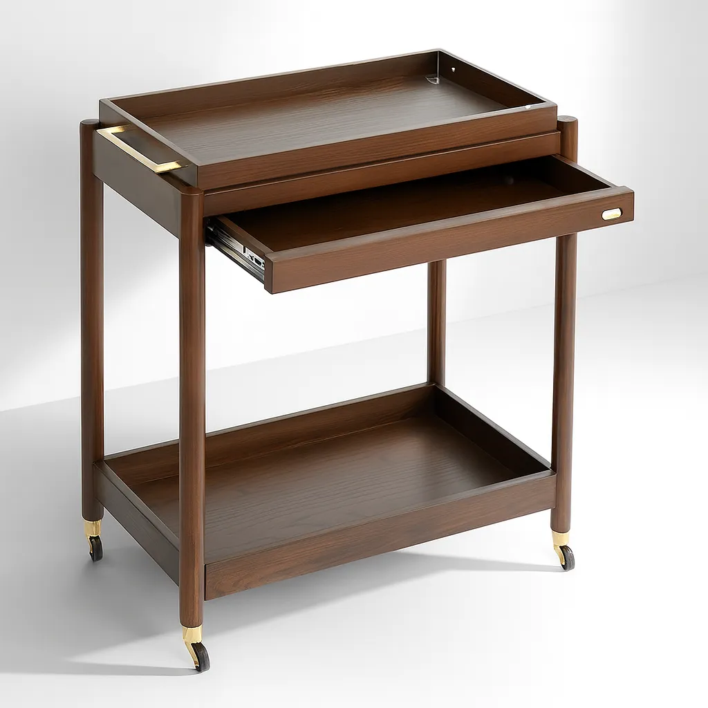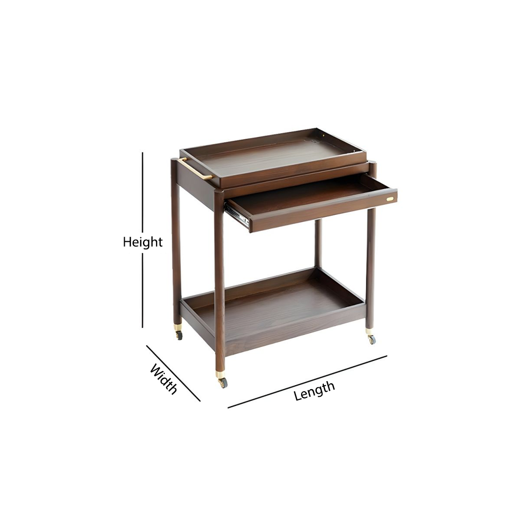 This modern wooden kitchen trolley is a versatile and practical addition to your home. Crafted with a sleek dark wood finish, it features a spacious top tray for serving, a pull-out drawer for utensils and essentials, and a lower shelf for extra storage. The golden accents on the handles and wheels add a touch of elegance while ensuring durability and smooth mobility.