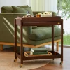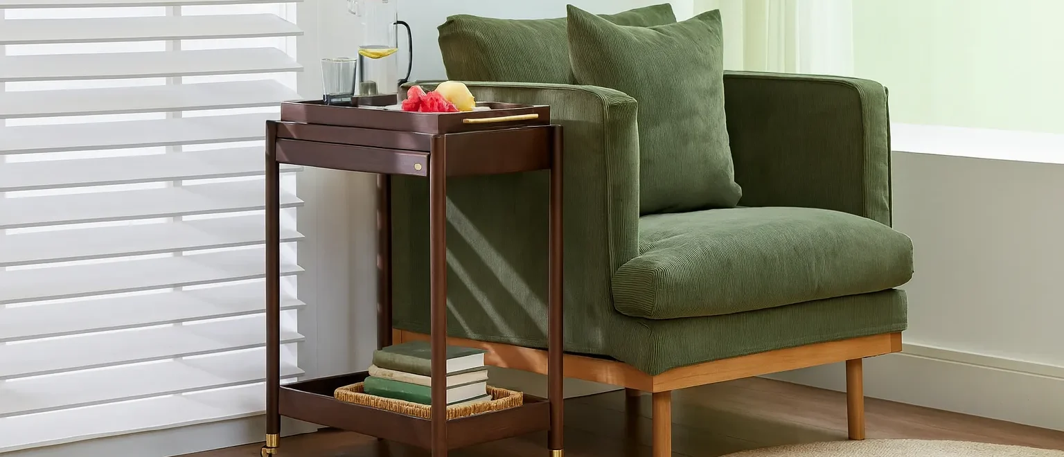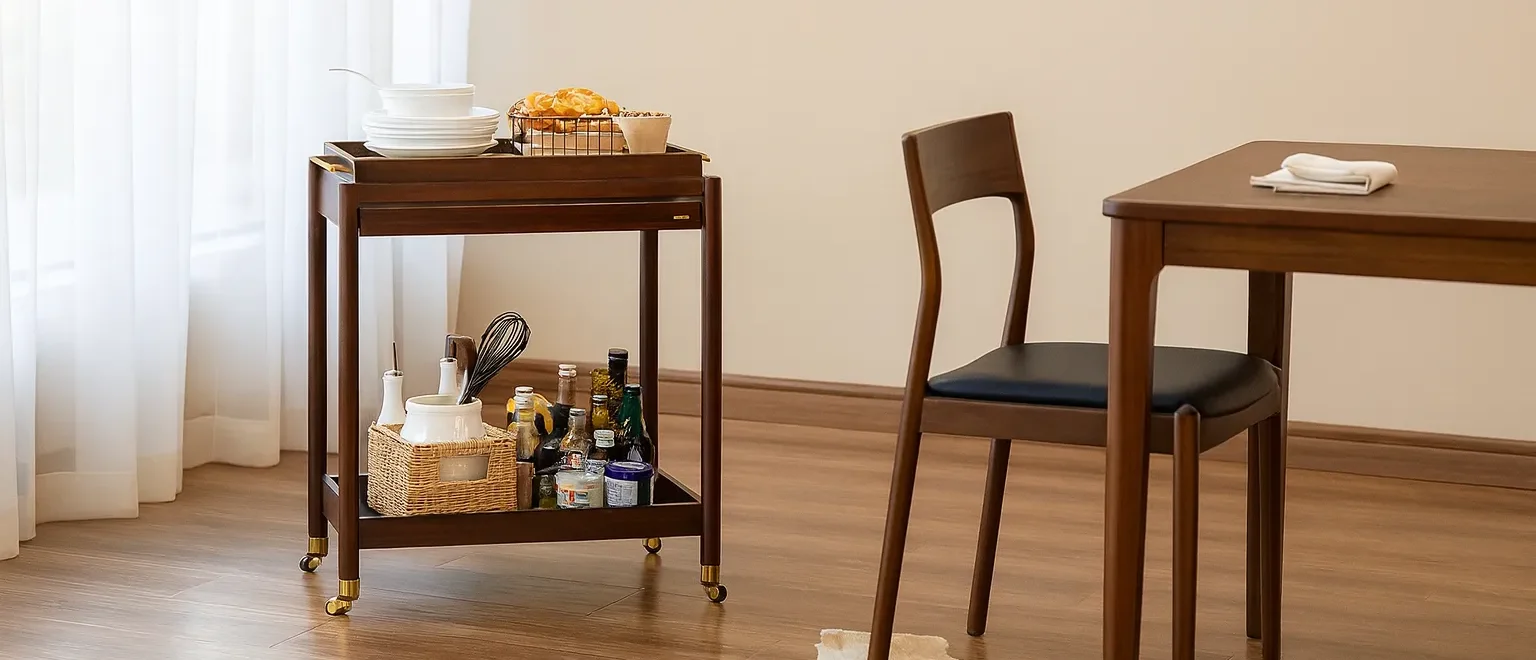 Stylish wooden kitchen trolley with pull out drawer, lower storage shelf, and smooth rolling wheels, perfect for serving, organizing, and entertaining.