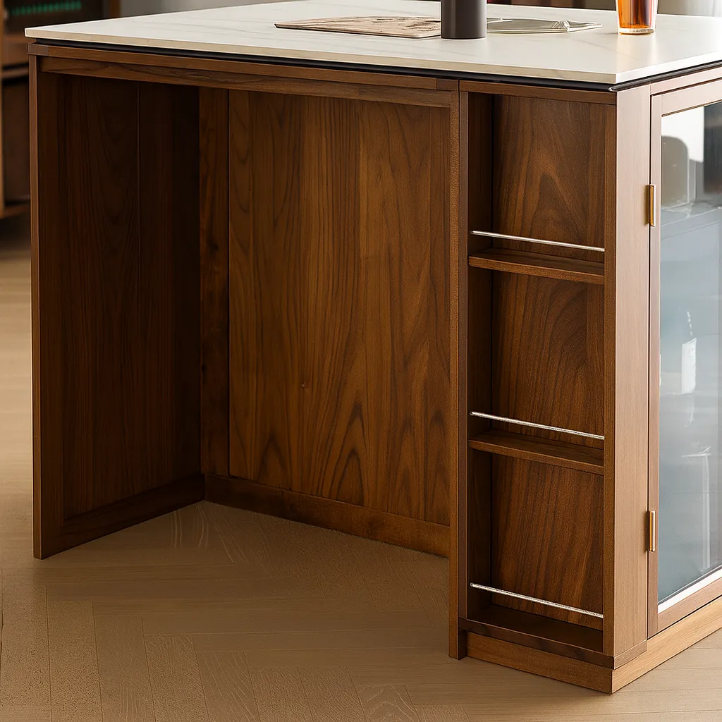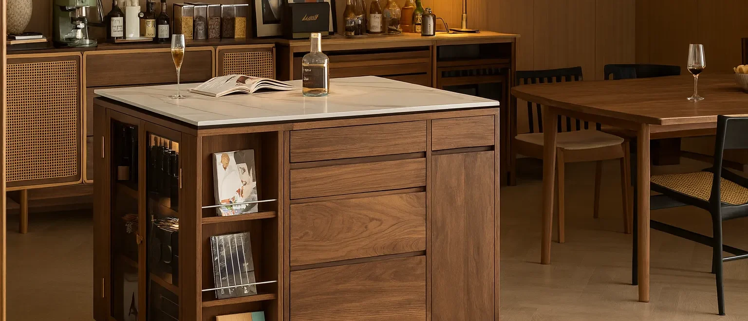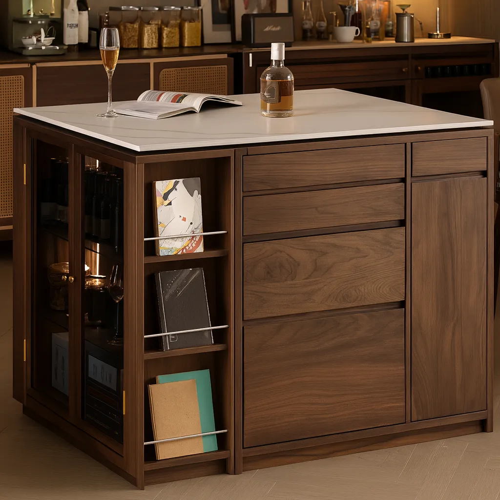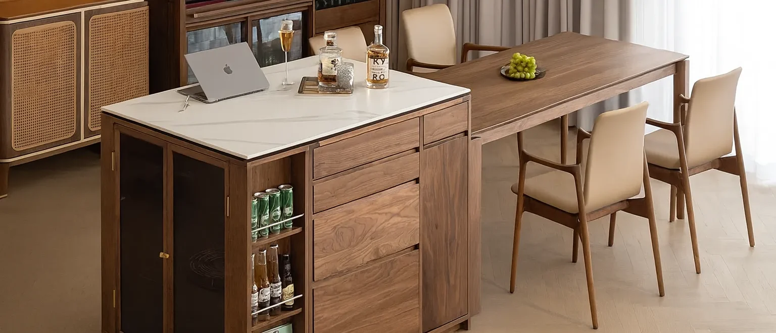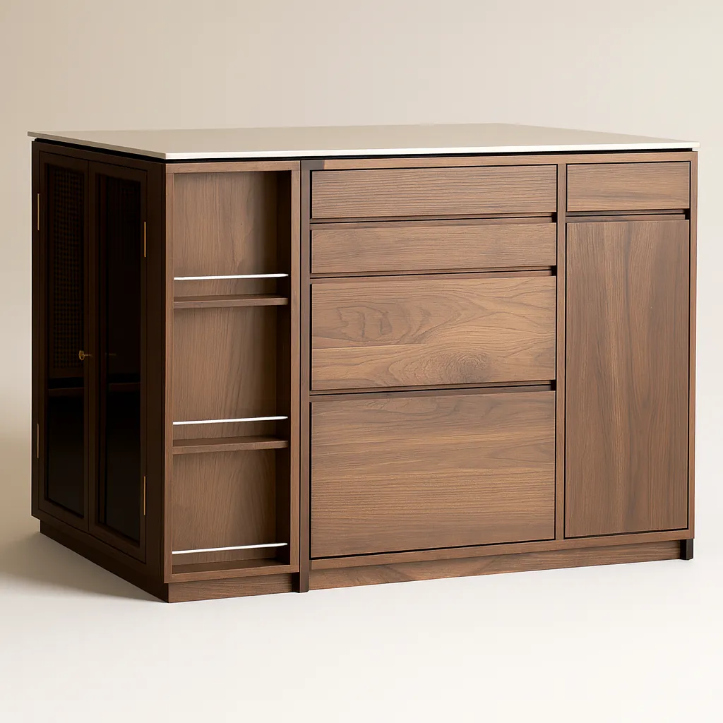 Elegant wooden sideboard with multiple drawers, side shelves, and cabinet doors, perfect for organizing and enhancing your dining room, living space, or office.