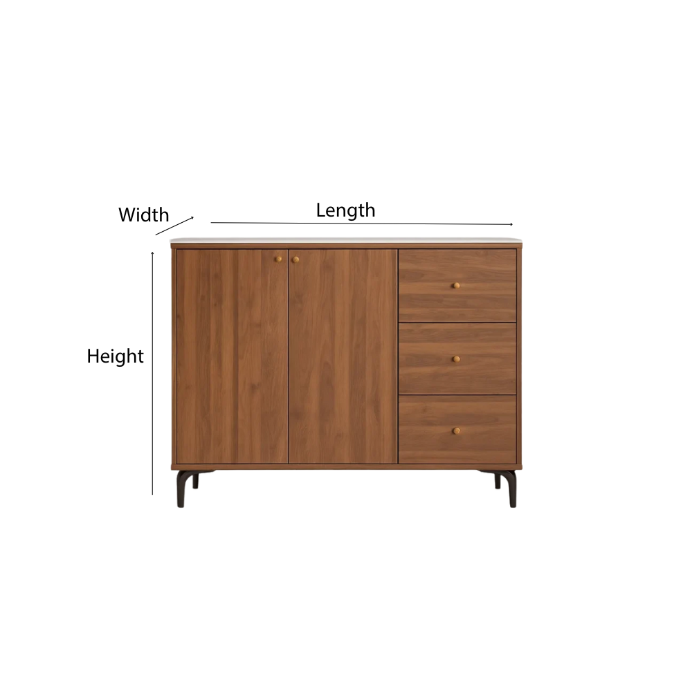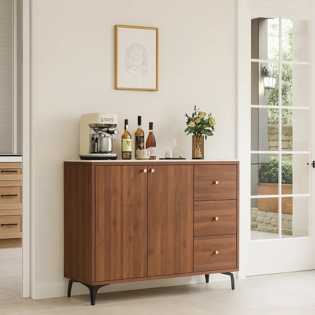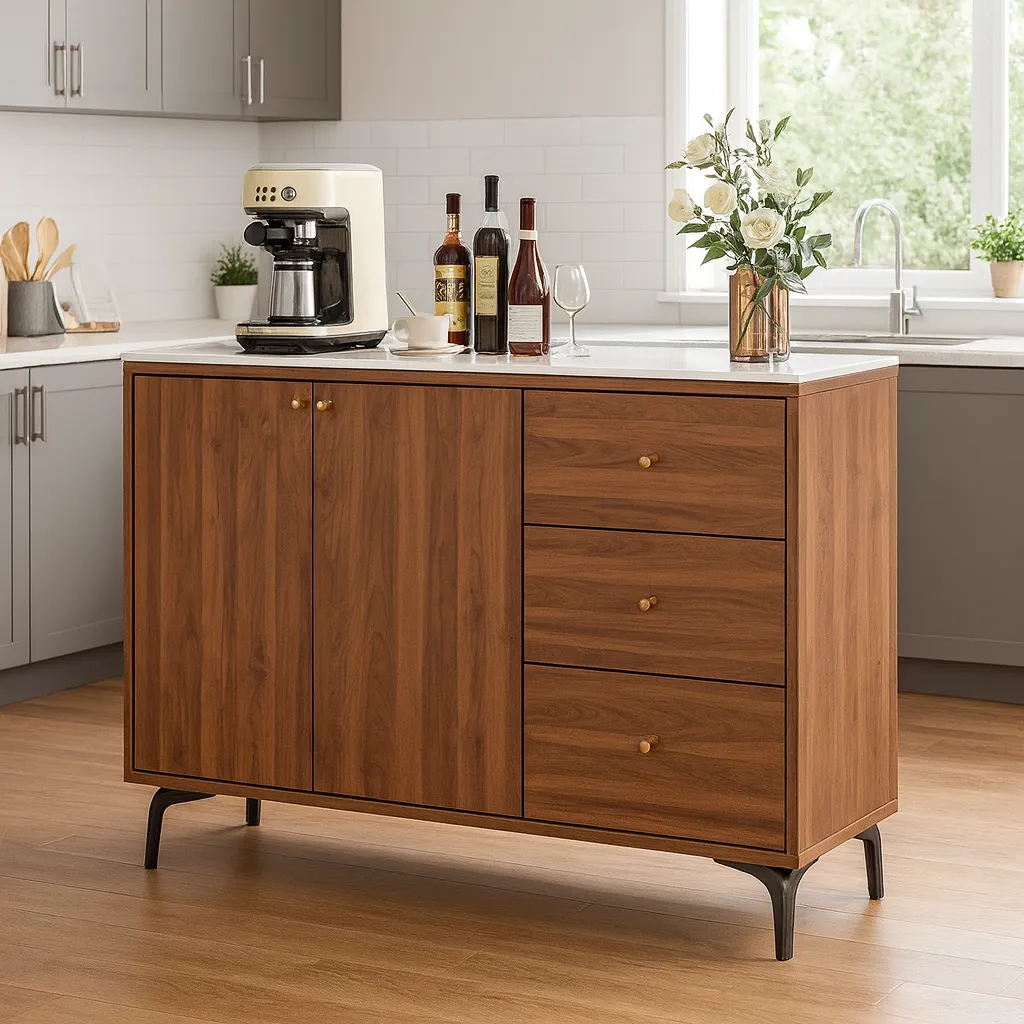 Designed with modern functionality, this wooden sideboard combines clean lines with practical storage solutions. The sintered stone countertop provides a durable and stylish surface, ideal for serving drinks, displaying decor or placing kitchen appliances. The unit includes a single door compartment with an adjustable shelf for flexible storage, along with multiple drawers that keep smaller items neatly arranged. Its sturdy frame and balanced proportions make it suitable for both everyday use and special occasions.