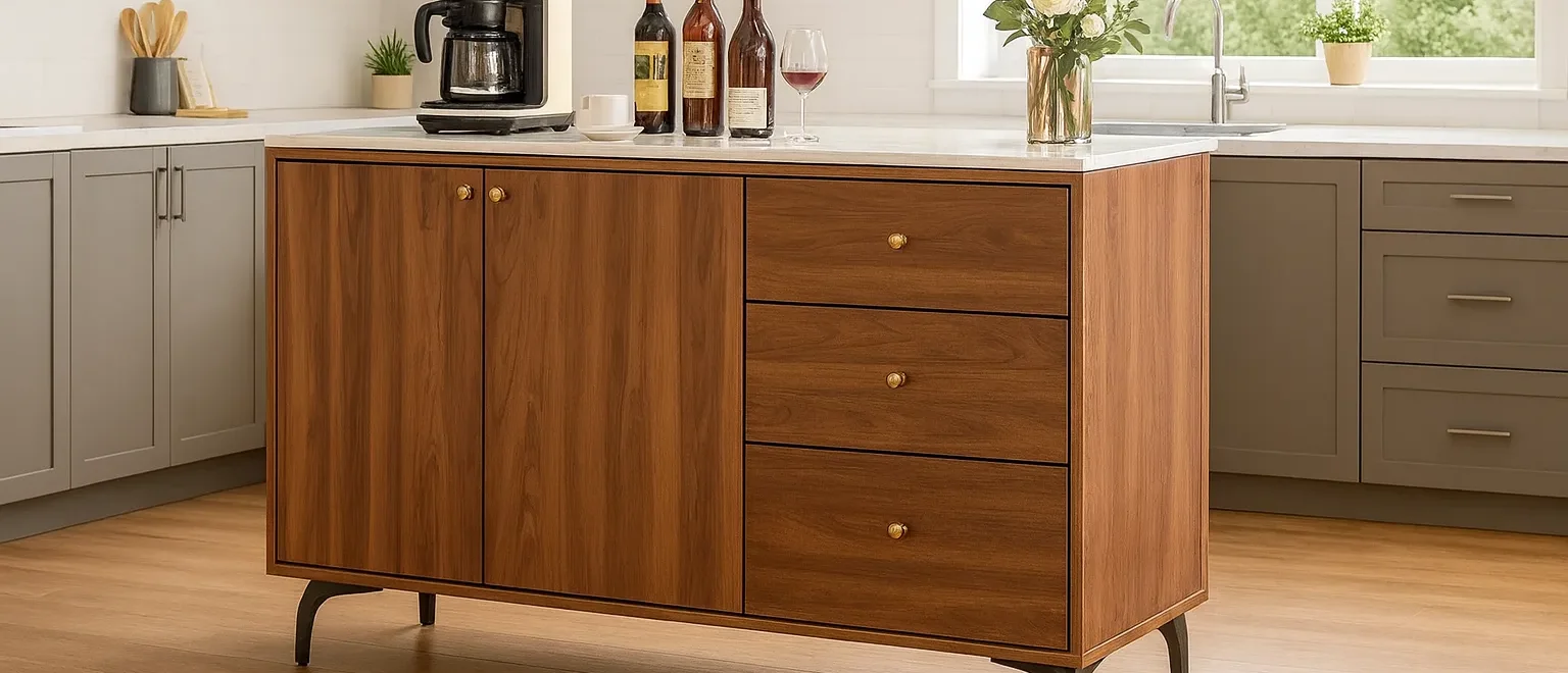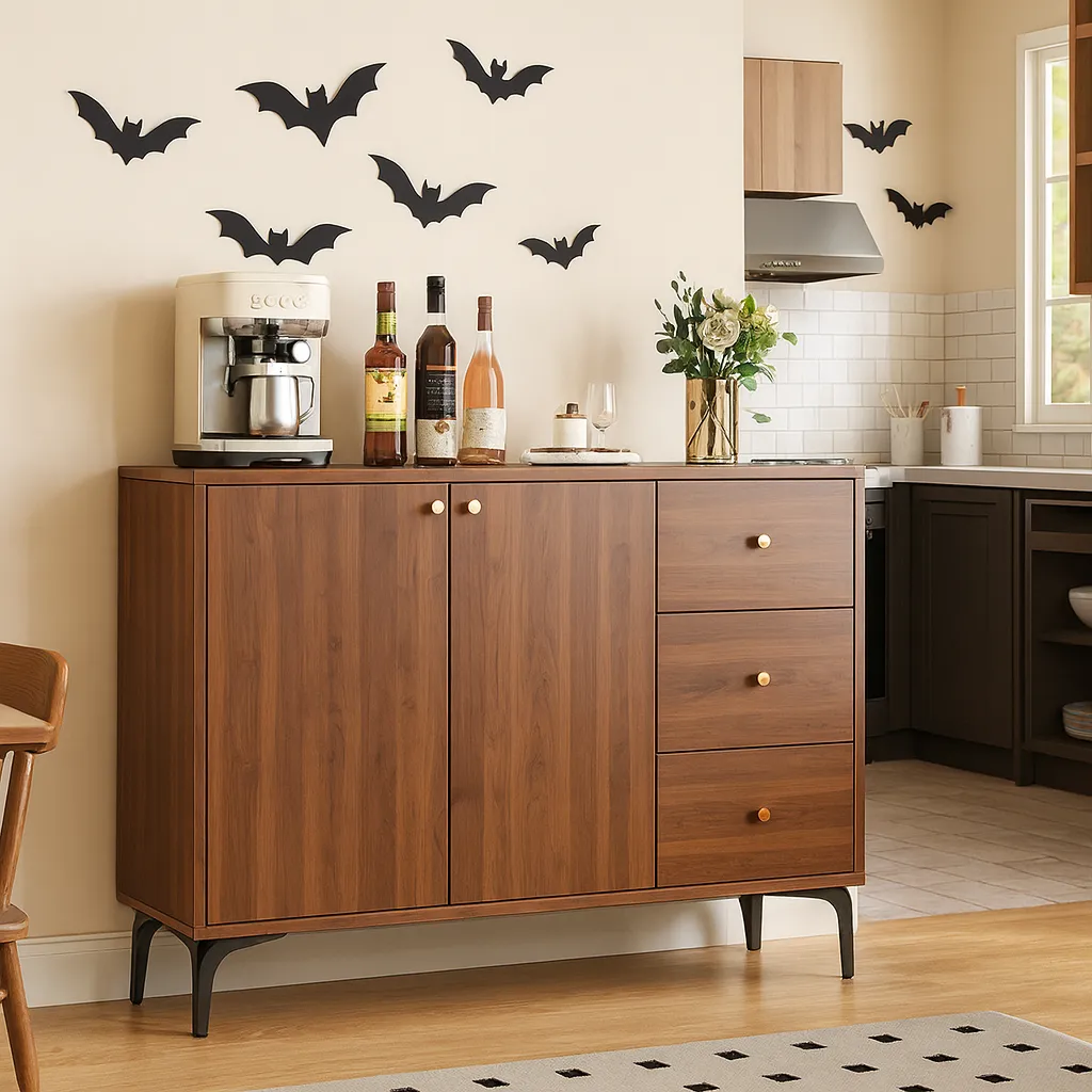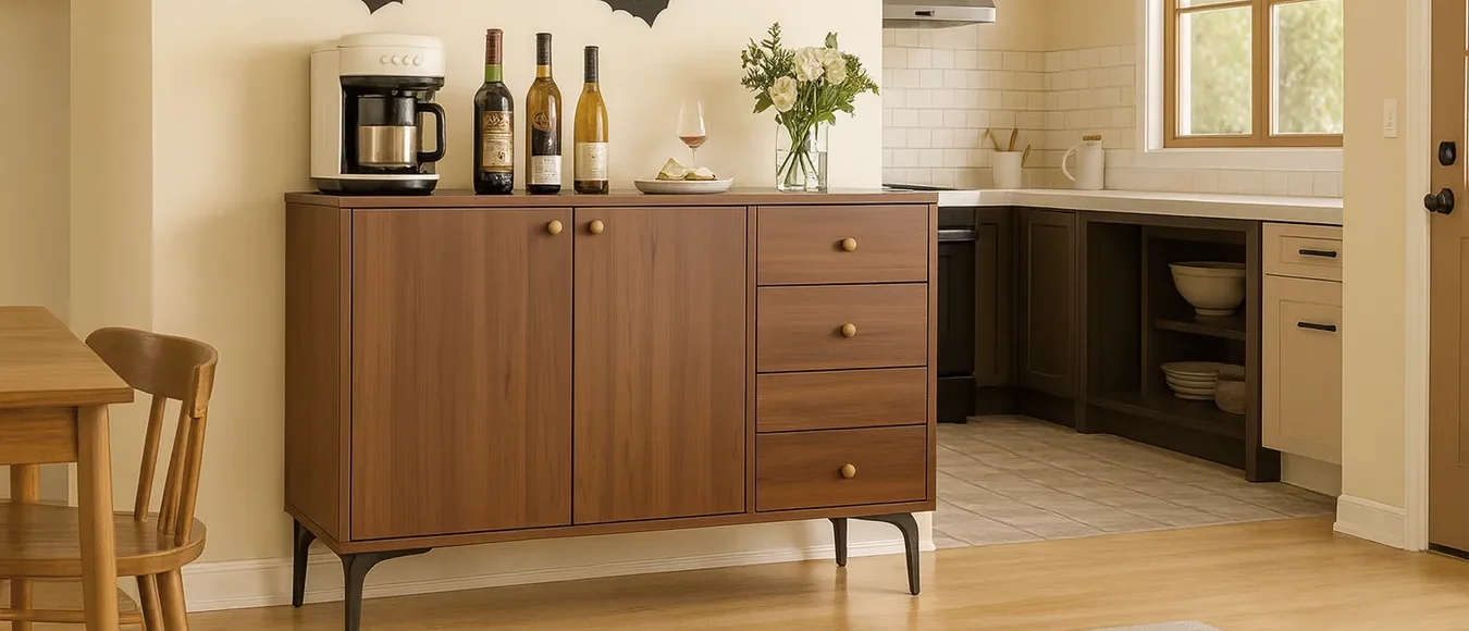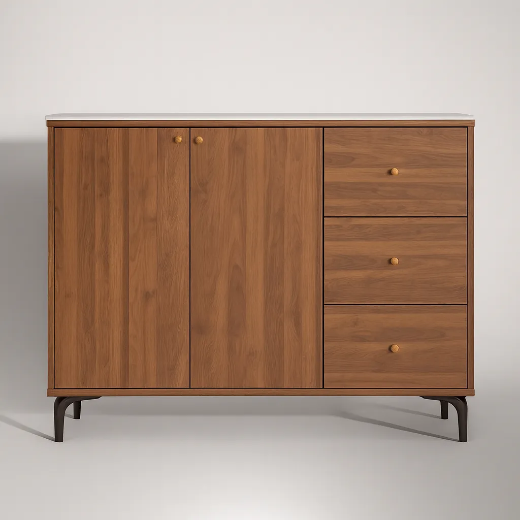 Designed with modern functionality, this wooden sideboard combines clean lines with practical storage solutions. The sintered stone countertop provides a durable and stylish surface, ideal for serving drinks, displaying decor or placing kitchen appliances. The unit includes a single door compartment with an adjustable shelf for flexible storage, along with multiple drawers that keep smaller items neatly arranged. Its sturdy frame and balanced proportions make it suitable for both everyday use and special occasions.