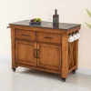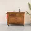 Rustic wooden kitchen island cart with two drawers, double door cabinet, towel racks, smooth rolling wheels.
