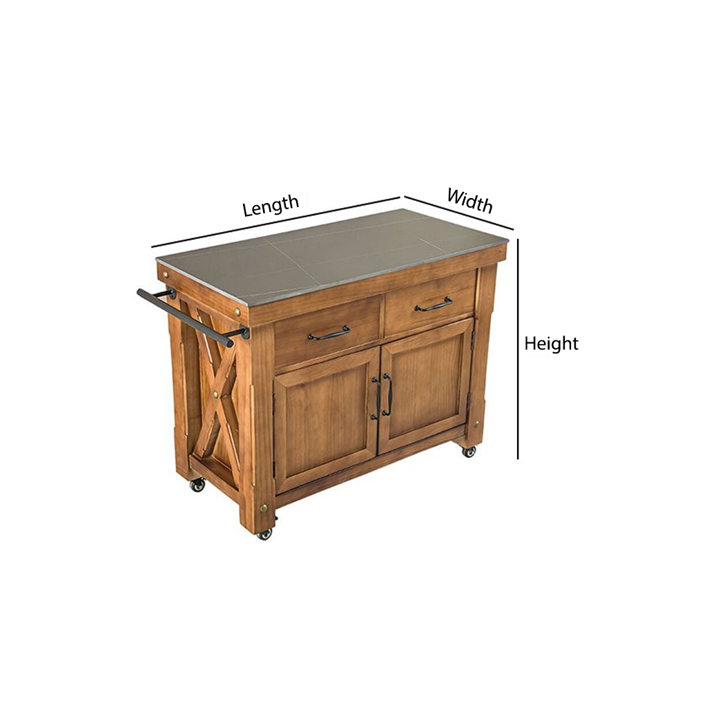 Rustic wooden kitchen island cart with two drawers, double door cabinet, towel racks, smooth rolling wheels.