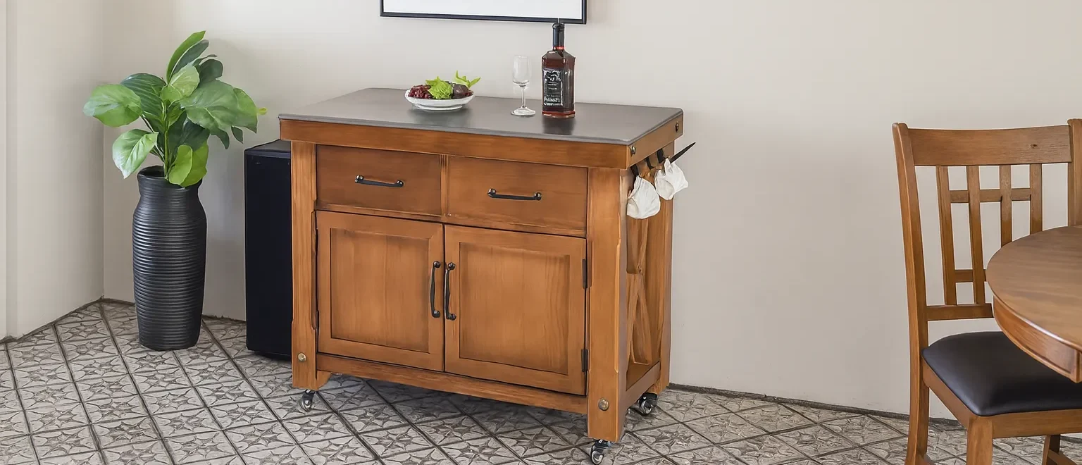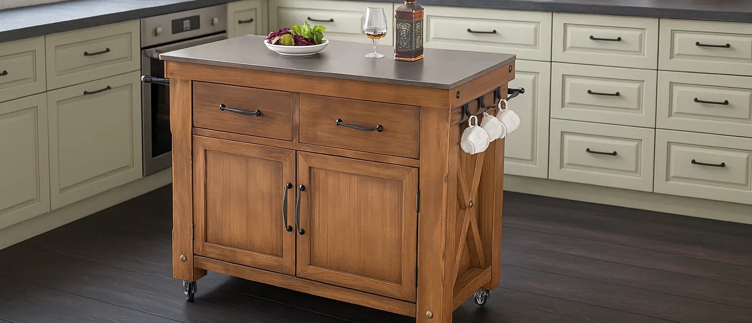 This versatile kitchen island cart combines rustic charm with practical functionality, making it a great addition to modern or traditional kitchens. The island features a smooth countertop that’s ideal for preparing meals or serving drinks. Two spacious drawers keep utensils and small essentials organized, while the double-door cabinet provides ample storage for cookware, dinnerware, or pantry items.
