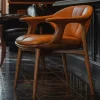 This modern wooden dining chair offers a refined balance of elegance and comfort. The wooden frame showcases smooth curves, while the upholstered seat and backrest provide a supportive and inviting sitting experience. Designed with armrests and a contoured structure, the chair ensures ergonomic comfort during long meals or gatherings. The leather-like upholstery complements the rich wood finish, adding a touch of sophistication to any interior.